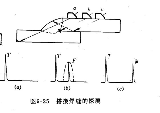 二、搭接焊缝探伤 搭接焊缝探伤可用下图方法所示,探头在c位置时,荧光屏上出现焊角反射波。当探头向焊缝方向移动,声波遇到缺陷时,将出现缺陷波。超声波探伤仪探头在b位置时,缺陷波最大,探头由b向前移动时,缺陷波幅逐渐降低(缺陷波位置前移)。探头在a位置时,声波透过焊缝,在下部板中传播,荧光屏上无射波。