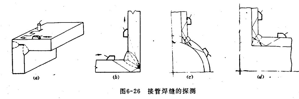 三、接管焊缝 接管焊缝的探伤方法,视工件的几何形状而定,一般可用横波探测,但在条件允许下,可用纵波探测危险性缺陷,效果较好。