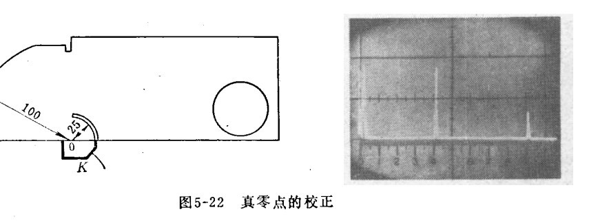 九、斜探头真零点的校正 斜探头声波经过有机玻璃延迟一段时间后,射入工件,这一段时间需在荧光屏零点刻度上予以校正。如下图示,探头在K处移动,直到获得从100毫米弧度反射回的波幅最高为止,然后调整扫描线的“水平位移”及“细调”,使两个反射波出现在40°及90°处为止。刻度40°的波系从100毫米处直接反射回探头的波(路径200毫米),而90°处的波系由100毫米处及25毫米槽处往复反射回至探头的波(路径450毫米)。此时,荧光屏的零点刻度即为声波离开斜探头有机玻璃楔块时的零点。
