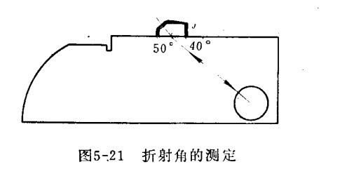八、折射角的测定 如下图示,探头在J位置,移动超声波探伤仪探头,直到获得从有机玻璃圆柱块处反射回的波幅最高为止,此时探头零点线在试块上所指的角度即为其折射角度(入射点至有机玻璃圆柱块中心的连线与零点线的夹角),试块上刻有几个固定的折射角。